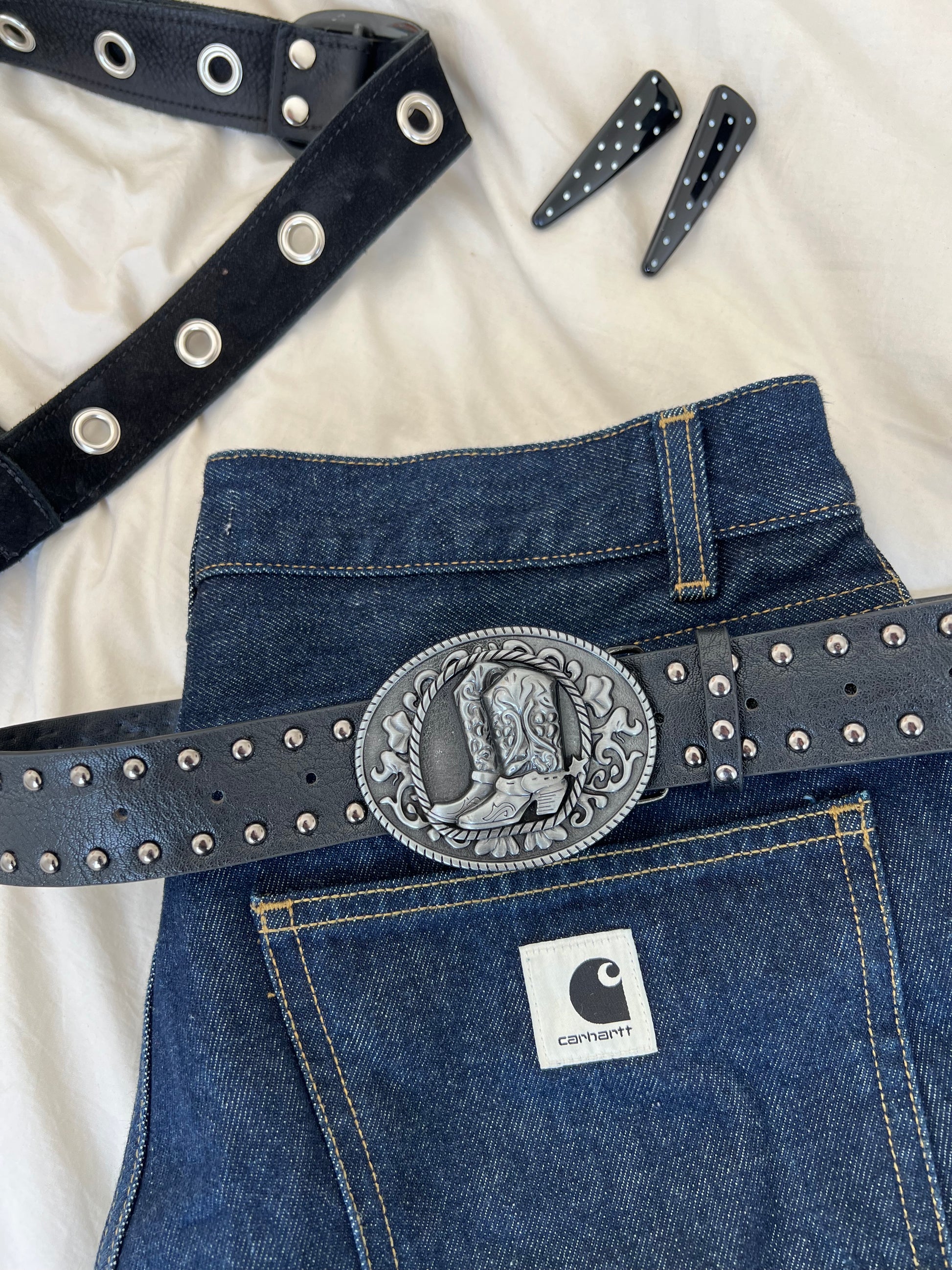 cinturon de cuero sintético negeo y hebilla con botas cowboy plateada