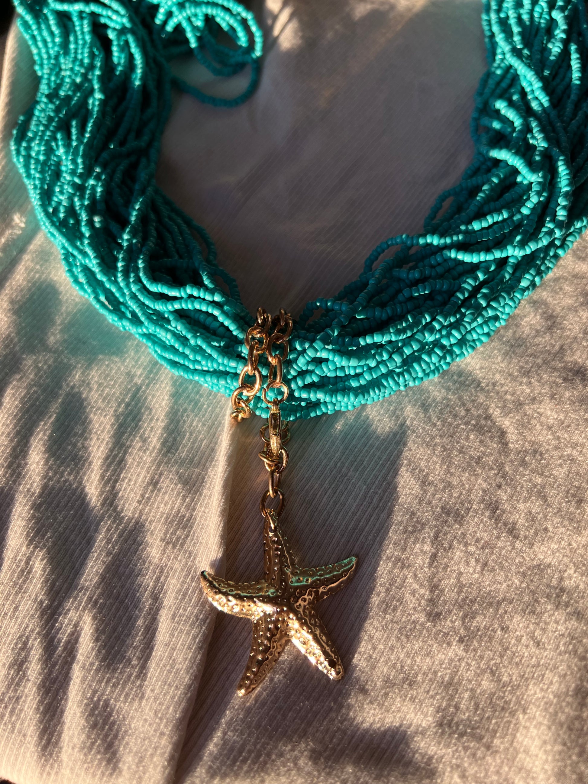collar super veraniego con mostacillas turquesas y estrella de mar dorada